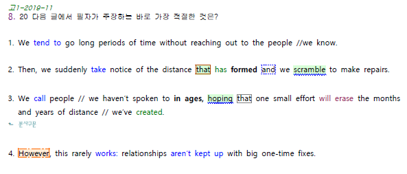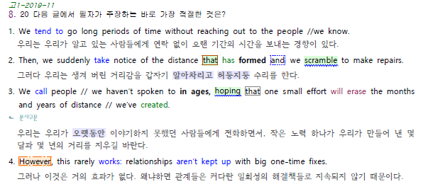 대부분의 지문이 주장하는 바를 강조하는 주제문이 있다. (한줄해석 노랑색 형광펜)
