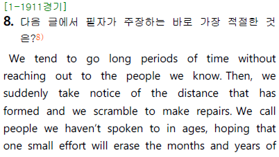 고1 전국연합학력평가(모의고사) 유형별 기출 문제 20번 글의 주장을 묻는 유형입니다.