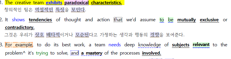 한줄해석의 파란색은 주절의 동사이고, 보라색은 명사절, 초록색은 형용사절, 갈색은 부사절내의 동사들을 구분 해 놓은 것입니다. 분석과 해석을 용이하게 하기 위함입니다.