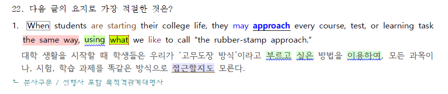 한줄해석의 파란색은 주절의 동사이고, 보라색은 명사절, 초록색은 형용사절, 갈색은 부사절 내의 동사들을 구분해 놓은 것입니다. 분석과 해석을 용이하게 하기 위함입니다.