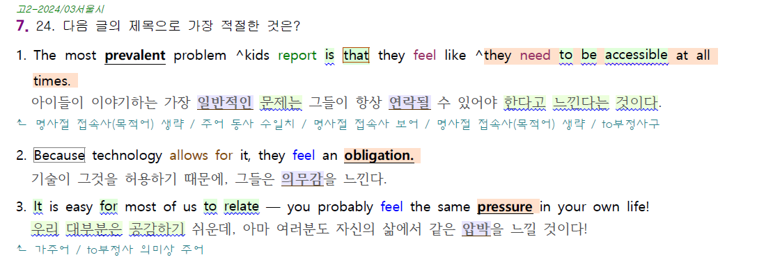 한줄해석의 파란색은 주절의 동사이고, 보라색은 명사절, 초록색은 형용사절, 갈색은 부사절 내의 동사들을 구분해 놓은 것입니다. 분석과 해석을 용이하게 하기 위함입니다.