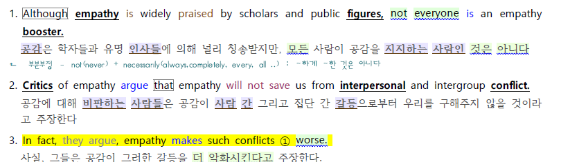한줄해석의 파란색은 주절의 동사이고, 보라색은 명사절, 초록색은 형용사절, 갈색은 부사절 내의 동사들을 구분해 놓은 것입니다. 분석과 해석을 용이하게 하기 위함입니다.